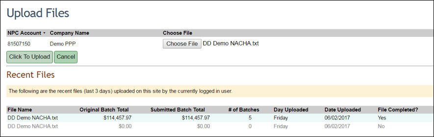 After you have selected your file, click the “Click to Upload” button. If the deposit date in your file already reflects the current date you will be taken to the review screen where your batch will be marked as Same-Day ACH (if you have uploaded your file prior to 1 p.m. EST).