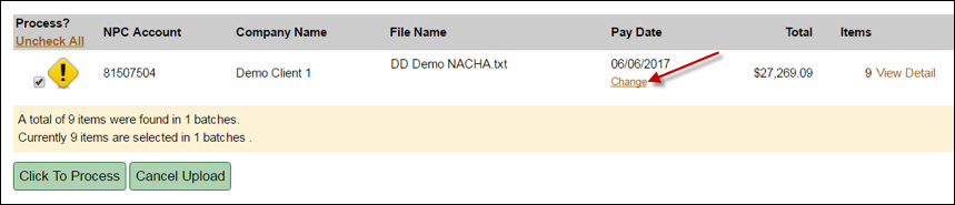 If your file has a deposit date other than today’s date and you’d like to make it a Same-Day ACH file, upload your file as normal, and then on the review screen, click on the “Change” link under the Pay Date header.